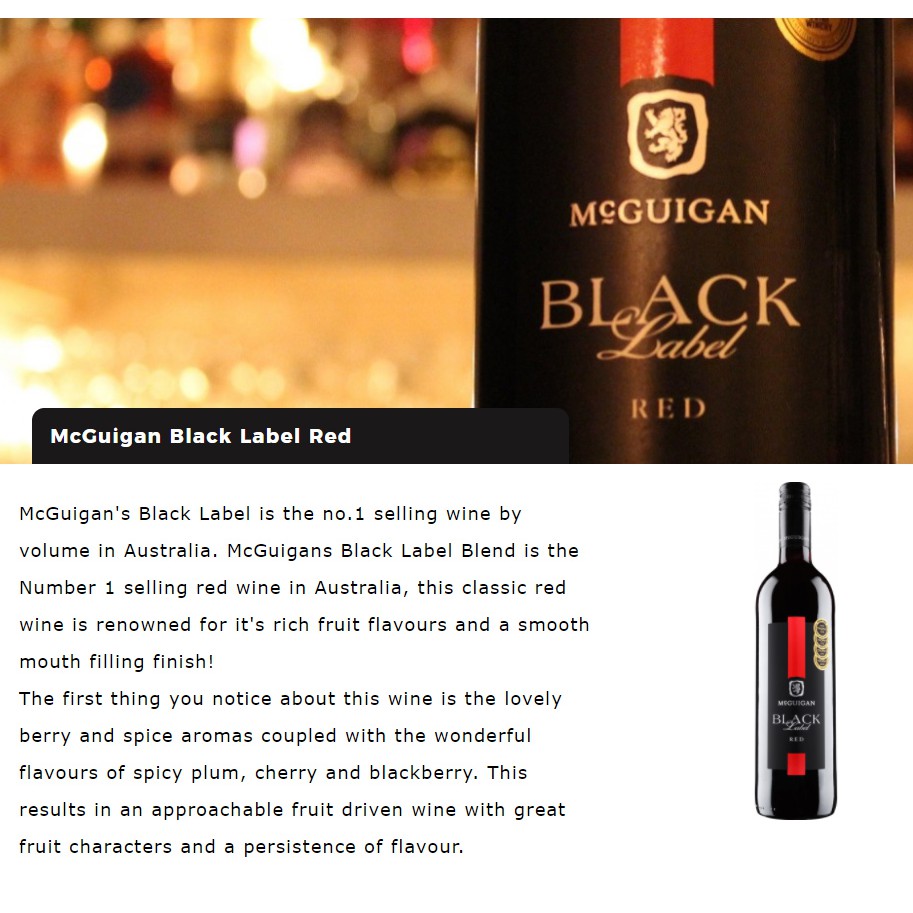 McGuigan Black Label Red, 75 cl (Case of 6) - Amazon This classic red wine is no exception and was blended to achieve exactly this. The McGuigan Black Label Red is a very consistent wine which has made it an all time favourite and one of the top selling branded red wines in Australia The fruit for this wine is sourced from our vineyards in South Australia, Victoria and New South Wales.