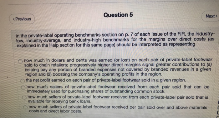 Solved Question 7 Previous Next> In the private-label - Chegg question 7 previous next> in the private-label operating benchmarks section on p. 7 of each issue of the fir, the industry- low, industry-average, and industry-high benchmarks for the margins over direct costs (as explained in the help section for this same page) should be interpreted as representinga a cash that can be used to pay bank loans or …