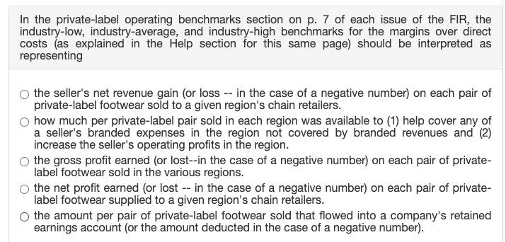 In the private-label operating benchmarks section on p. 7 ... - Course Hero in the private-label operating benchmarks section on p. 7 of each issue of the fir, the industry- low, industry-average, and industry-high benchmarks for the margins over direct costs (as explained in the help section for this same page) should be interpreted as representing o how much sellers of private-label footwear received from each …