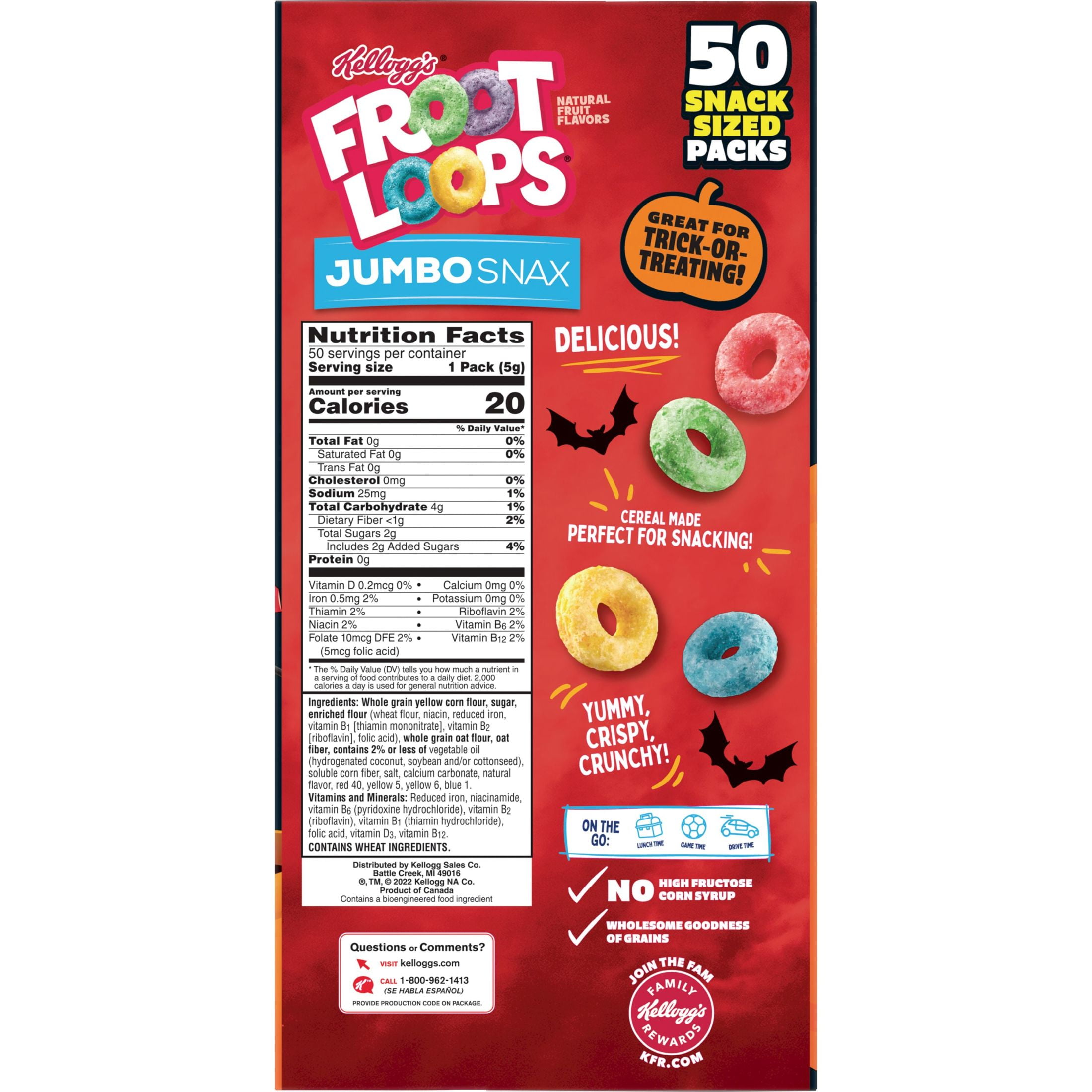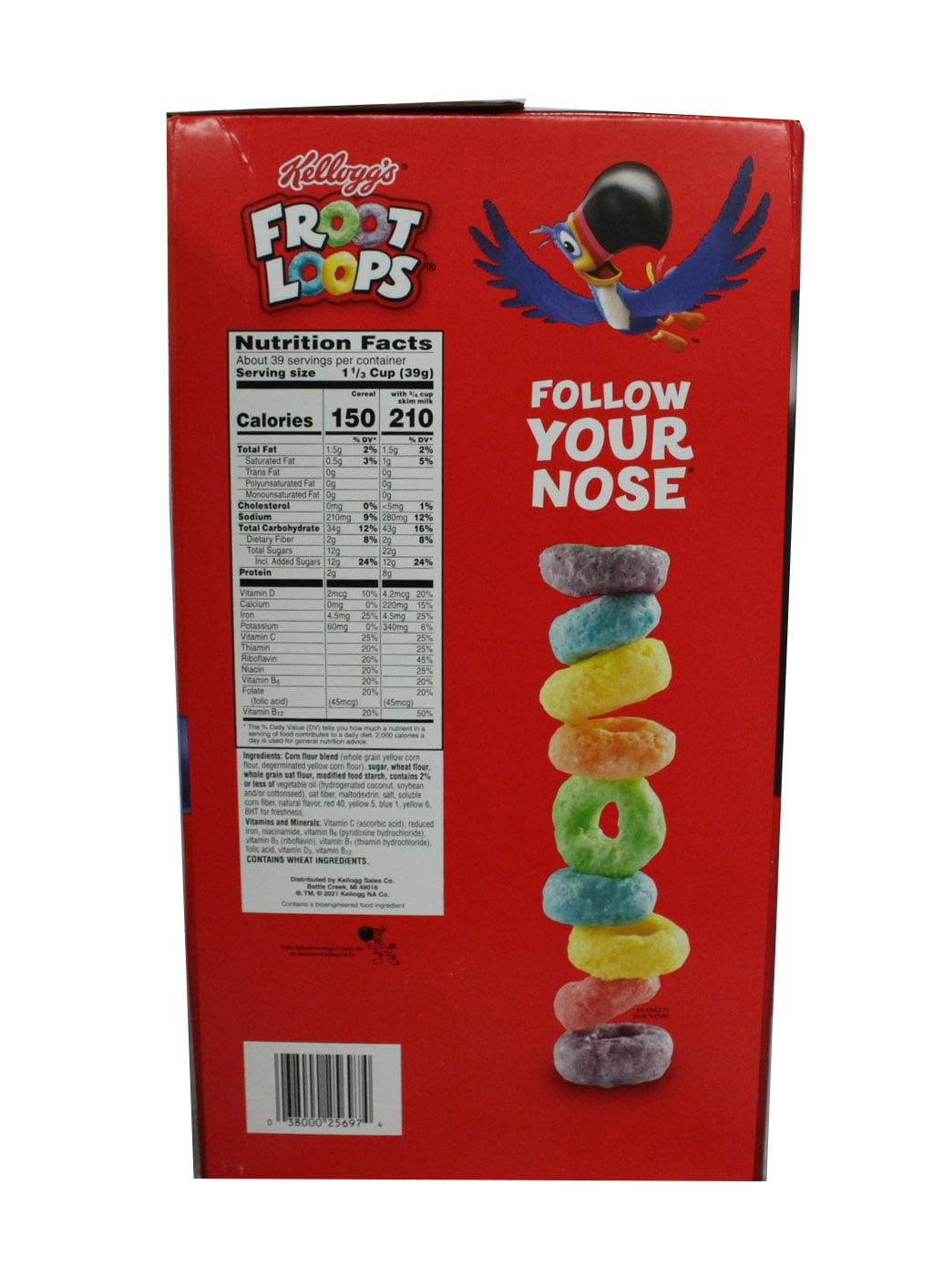 Fruit Loops - Nutrition Label Nutrition Facts Serving Size 1 cup ... INGREDIENTS: KELLOGG'S FROOT LOOPS (Sugar, corn flour blend (whole grain yellow corn flour, degerminated yellow corn ... Calories in Kellogg's Fruit Loops - FatSecret South Africa Oct 19, 2015 ... There are 106 calories in 1 serving (30 g) of Kellogg's Fruit Loops. Nutrition Facts. Serving Size. 1 serving (30 g). per serve. Cereals ready-to-eat, KELLOGG, KELLOGG'S FROOT LOOPS, 1 ... Nutrition Facts. Cereals ready-to-eat, KELLOGG, KELLOGG'S FROOT LOOPS, 1 cup (1 NLEA serving). Protein (g). 1.51. Total lipid (fat) (g). 0.93.