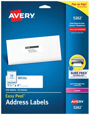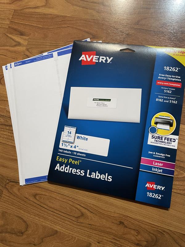 Avery Easy Peel Address Labels 1-1/3" x 4" 1400 Labels (5162) Avery® Easy Peel® Address Labels, Sure Feed™ Technology, Permanent Adhesive, 1-1/3" x 4", 1,400 Labels (5162) 4.9 out of 5 stars. Read reviews for average ...